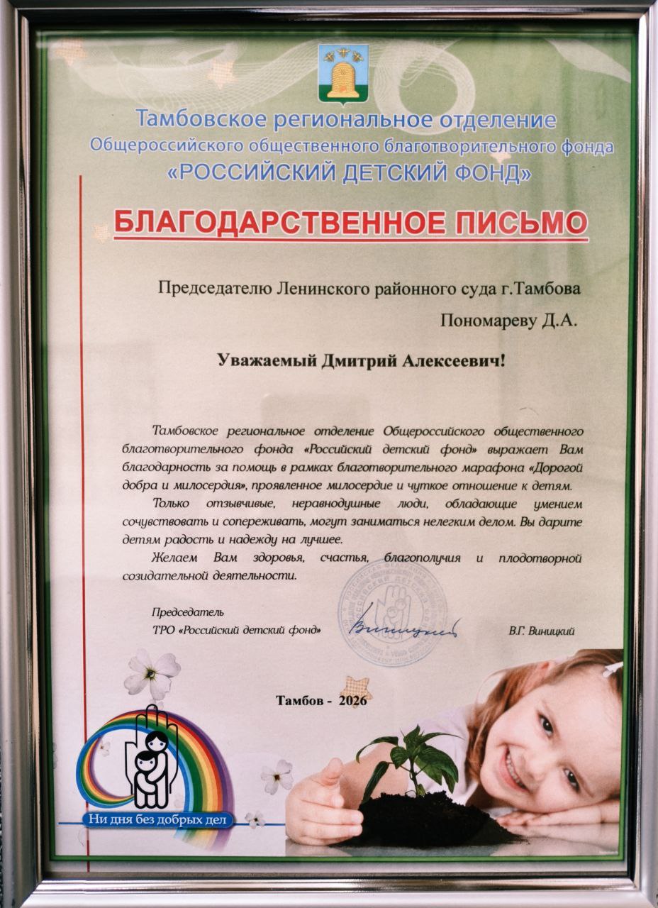 Заключительный этап традиционной акции «Дерево добра» Заместитель председателя Ленинского районного суда г. Тамбова Антипова Е.Ю. приняла участие в заключительном этапе традиционной благотворительной акции «Дерево добра», которая реализуется Тамбовским региональным отделением «Российского детского фонда» уже 24 года. В учебном театре ТГУ имени Державина для детей-сирот и детей из малообеспеченных семей был устроен замечательный праздник. Накануне Нового Года от детей в Российский детский фонд поступают письма к Деду Морозу, где они просят подарить им что-то интересное, нужное и необычное. Ленинский районный суд в числе других судов города Тамбова принял активное участие в приобретении подарков и на торжественном мероприятии представители судов вручили подарки детям. ![]() ![]() |