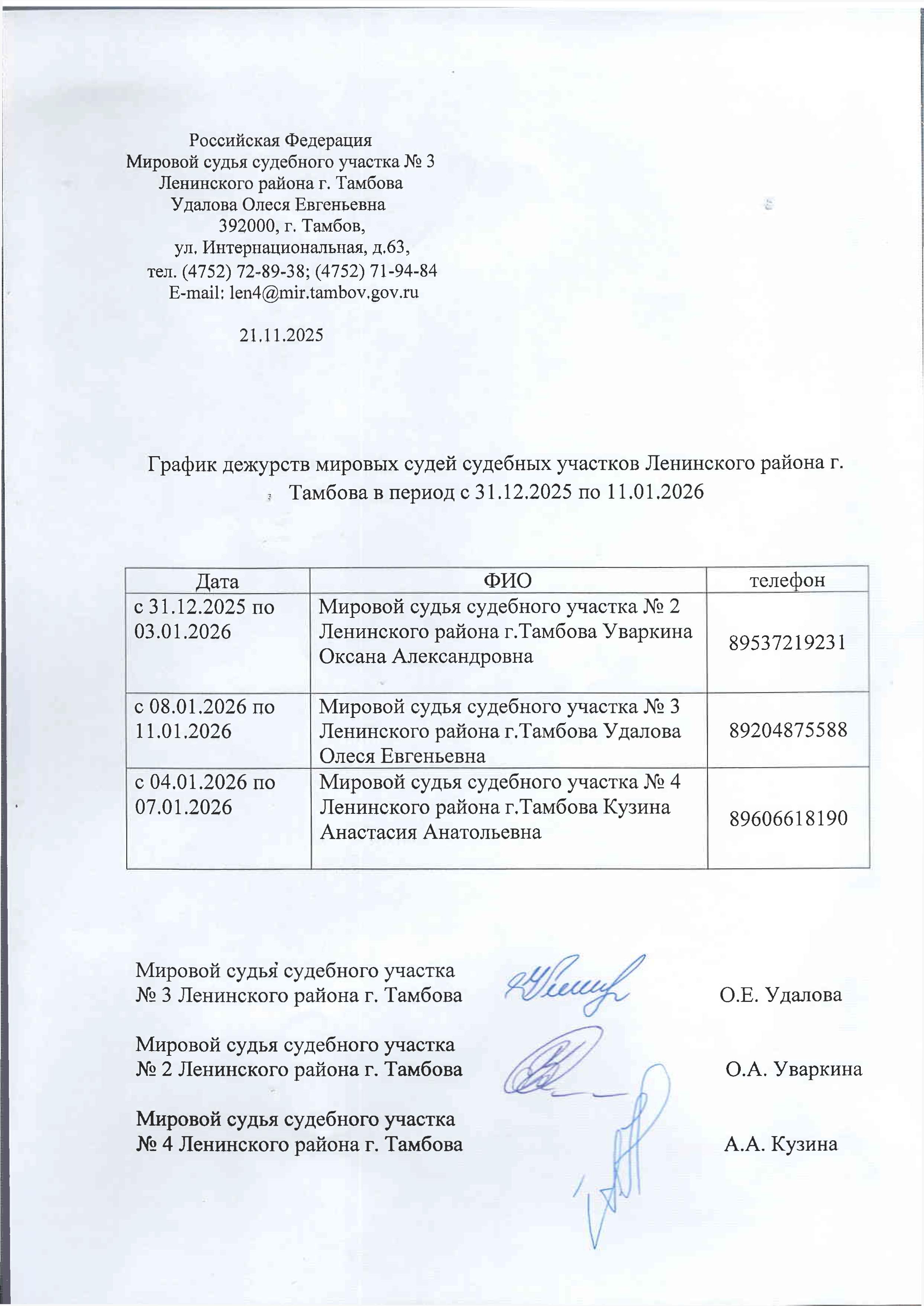График дежурства мировых судей судебных участков Ленинского района г. Тамбова в период с 31.12.2025 по 11.01.2026