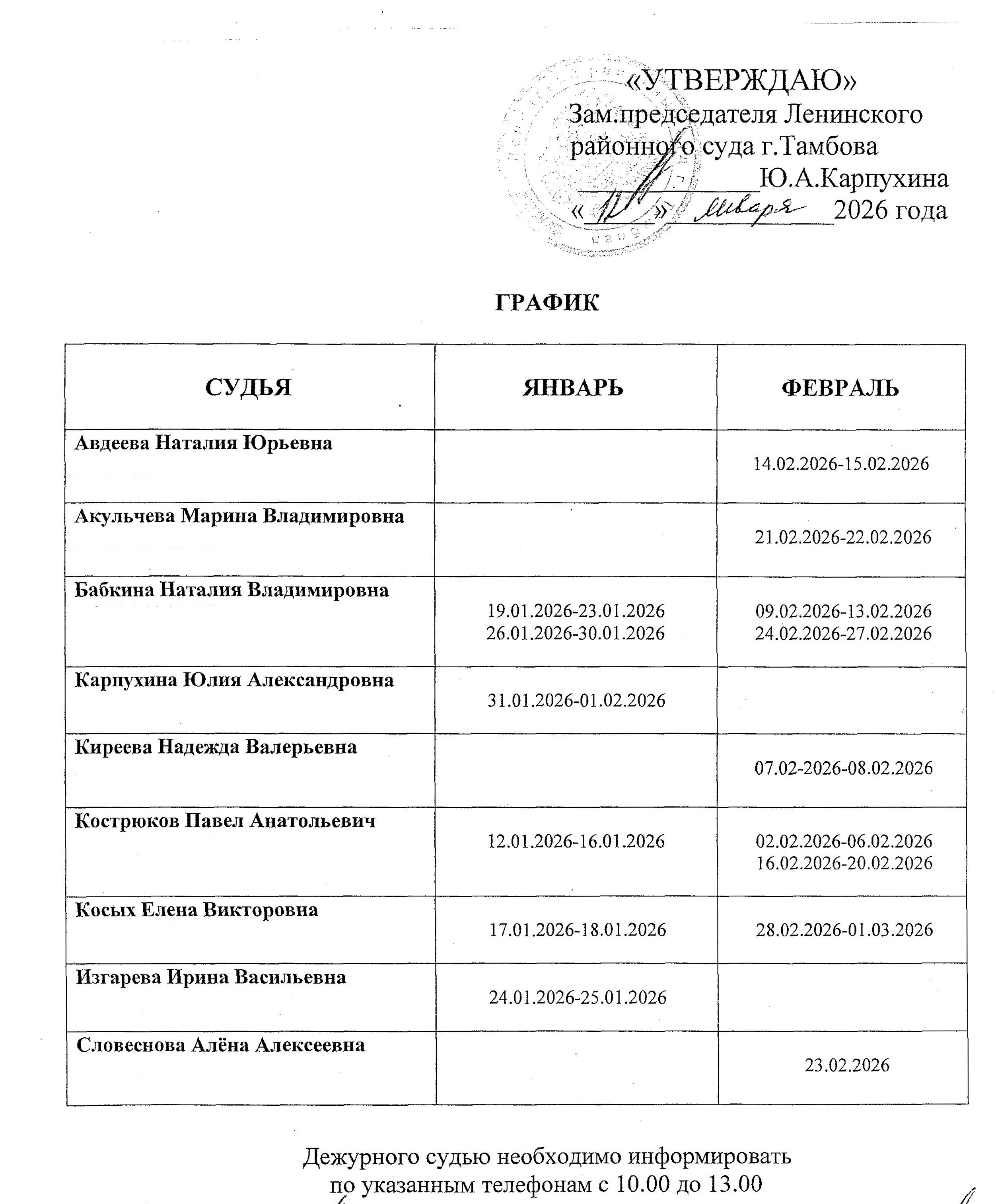 График дежурства судей гражданской коллегии на январь-февраль 2026 г.