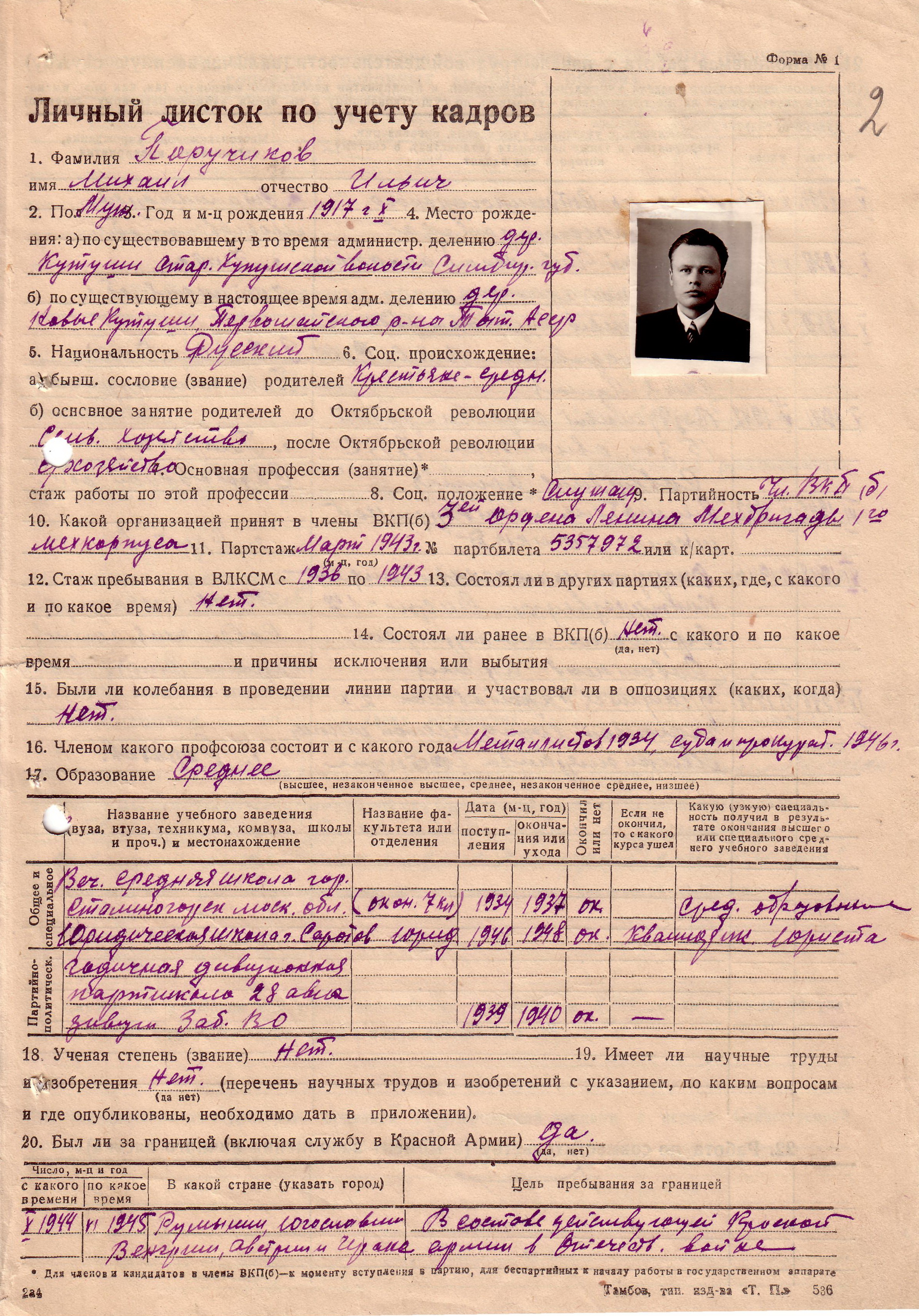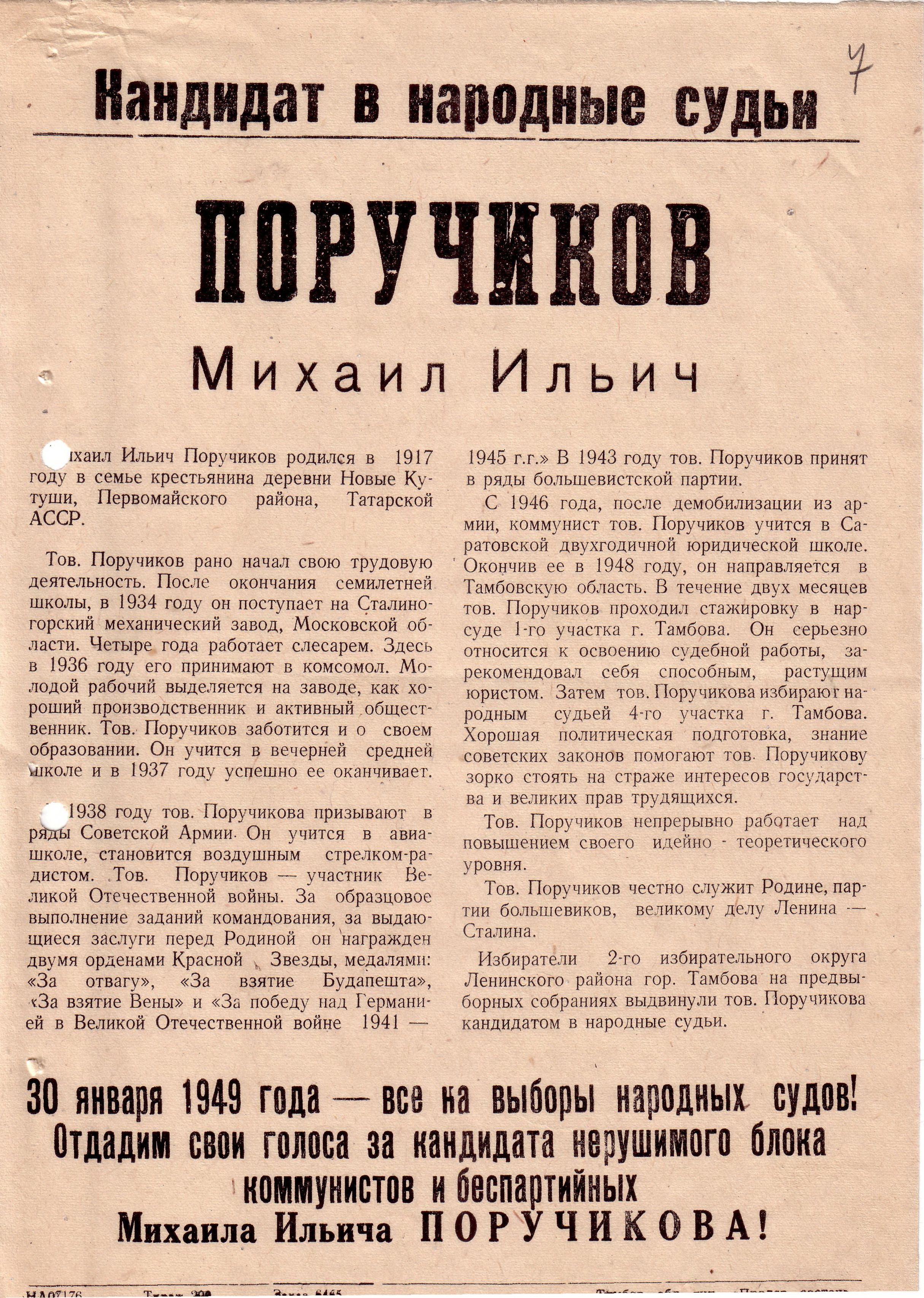 Поручиков Михаил Ильич родился в 1917 году в Татарской АССР. Рано начал свою трудовую деятельность. С 1934 года работает на заводе слесарем. С 1938 года призван в ряды Советской Армии. С 1946 года учится в Саратовской двухгодичной юридической школе. Окончив её в 1948 году, направляется в Тамбовскую область. В течение двух месяцев проходил стажировку в нарсуде 1-го участка г.Тамбова. Затем работал народным судьей 4-го участка г.Тамбова. 30 января 1949 года был избран народным судьёй 2-го участка Ленинского района г.Тамбова.