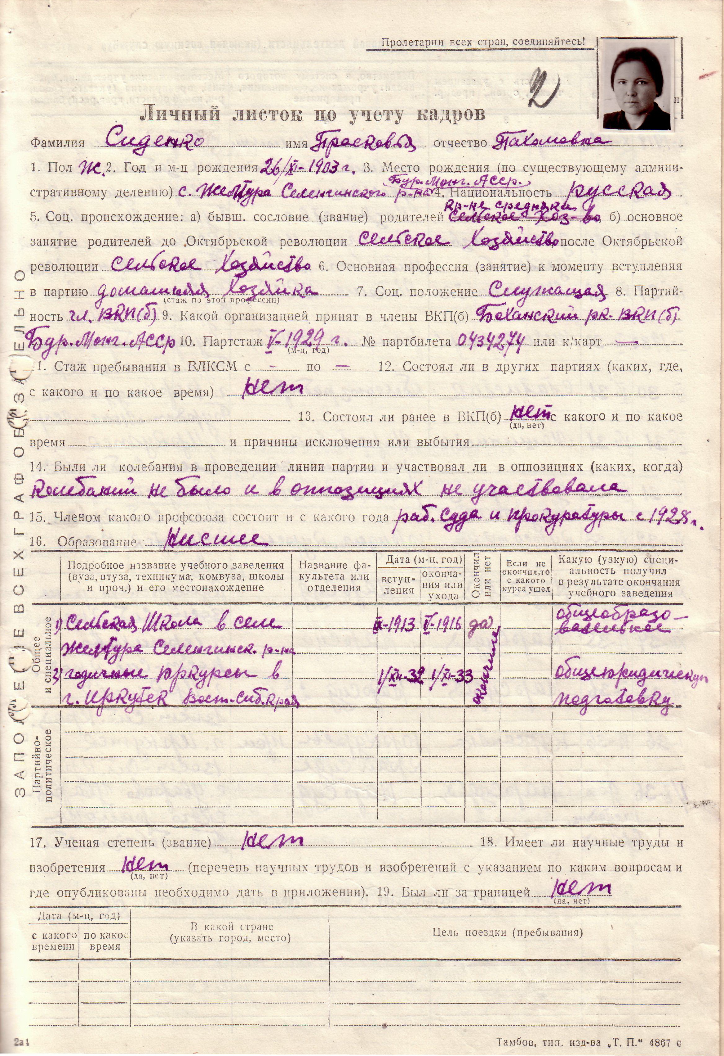 Сиденко Просковья Пахомовна родилась в 1930 году в с. Желтура Селегинского района Бурято- Монгольской АССР. С 1932 года по 1933 год являлась курсанткой юридических курсов в г.Иркутске. На судебной работе в органах юстиции работает с 1933 года: